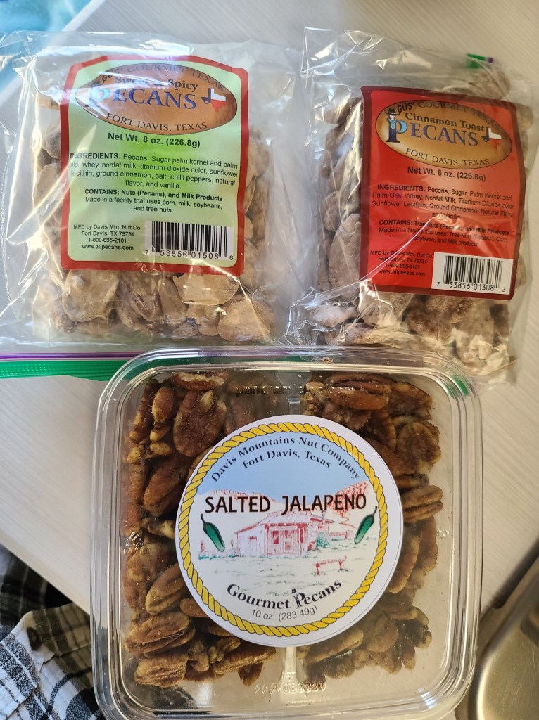 I walked in just before closing time hoping to just have a sample or two, grab a bag to support a local business and be on our way. Within minutes of talking to the owner, I instantly wished I had gotten there hours before. Davis Mountains Nut Co is owned by two brothers, but is now primarily ran by David, and that is who I had the pleasure of speaking with. Their slogan is “You can taste the difference care makes” and it’s perfect. I’m not a huge pecan fan and I’ve never seen them used with so man fun flavorings! Everything from Key Lime, to chocolate covered, to cinnamon coated, to flavored with Tang.
