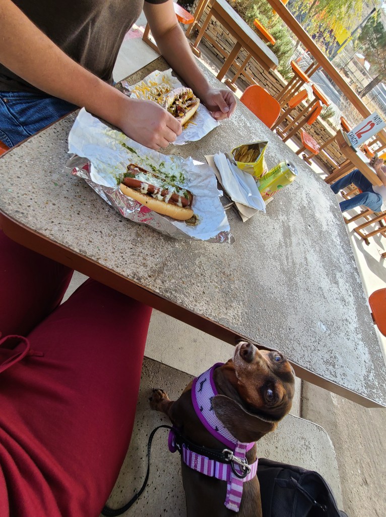 There’s a couple tables inside, but no outside dining, so we ordered our 3 meat plate and a Doggy Snack Pack for Butters to-go.