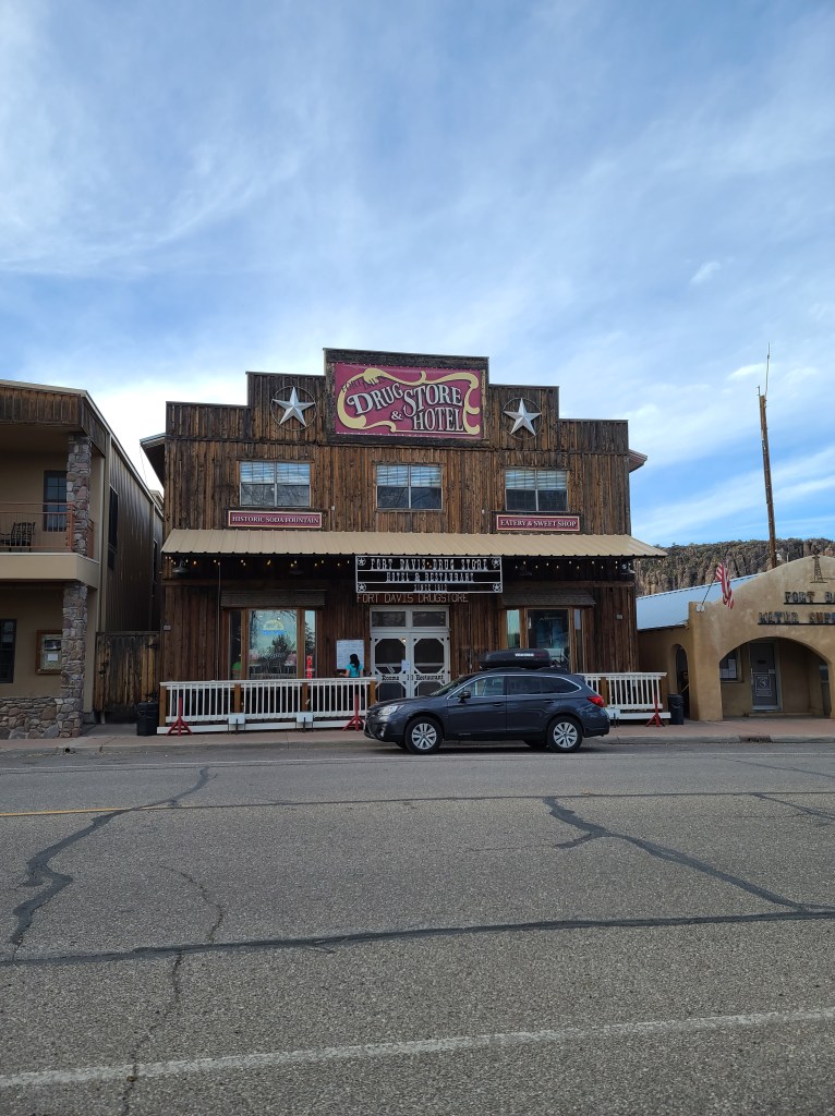 The Fort Davis Drug Store is located on State St. right about center of the main drive. You can’t miss it because it looks like Billy the Kid could come walking right out the front door guns blazing!