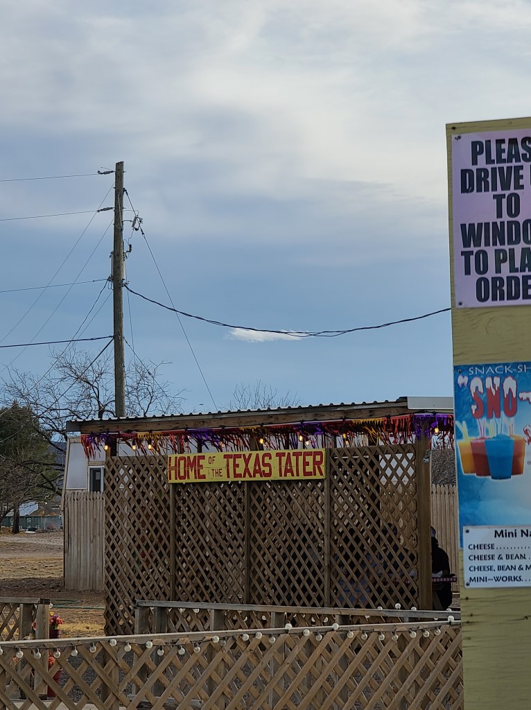 But when you pull up to what looks like is a house/restaurant combo, you’ll see a worn out sign saying “HOME OF THE TEXAS TATER”. Ok sign me up …