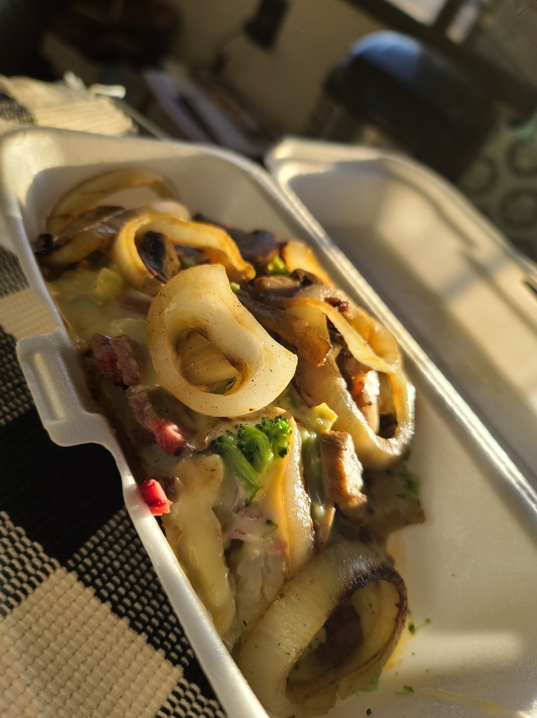 A massive sized potato topped with brisket, grilled onions, broccoli, cheese, sauce, maybe a kitchen sink in there … not sure. But it was amazing. I had to take one for the team and pretend I was too full to finish the rest so Anthony would stop giving me the puppy eyes and finish off “what I couldn’t have another bite of”. Full disclosure, I could have eaten two of these things. They are just that good.